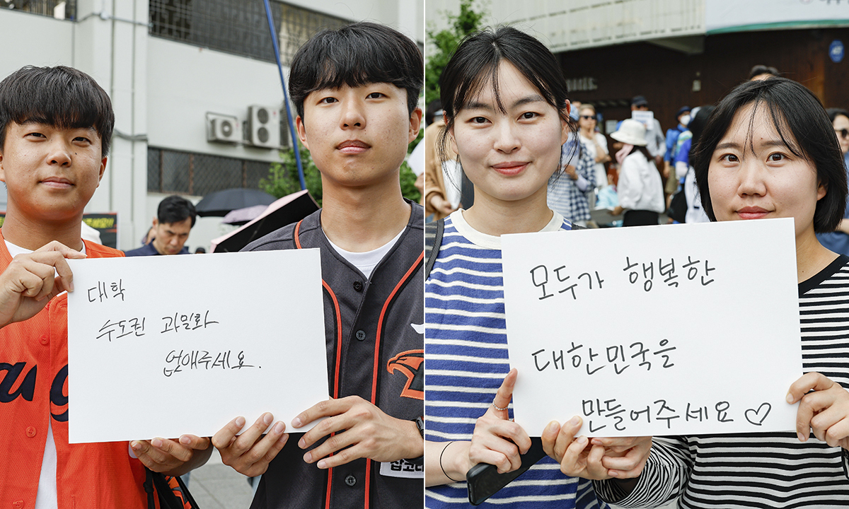 “행복·소통·경제 대한민국 만들어 주세요” ‘소통하는 대통령’, ‘모두가 행복한 대한민국’, ‘경제 살리기’, ‘평등하고 공정한 세상’…. 6·3 조기대선을 앞두고 거리에서 만난 대한민국 남녀노소 국민의 바람이다. 어느 하나라도 새 대통령과 정부가 새겨듣기에 소중하지 않은 것이 없다. 비상계엄과 대통령 탄핵 사태 속에서 사회갈등을 해소하고 경제위기를 극복해야 할 새 지도자를 뽑는 선거이기에 국민 소망은 어느 때보다 절실하다. 이제원 선임기자, 남정탁·최상수 기자 |