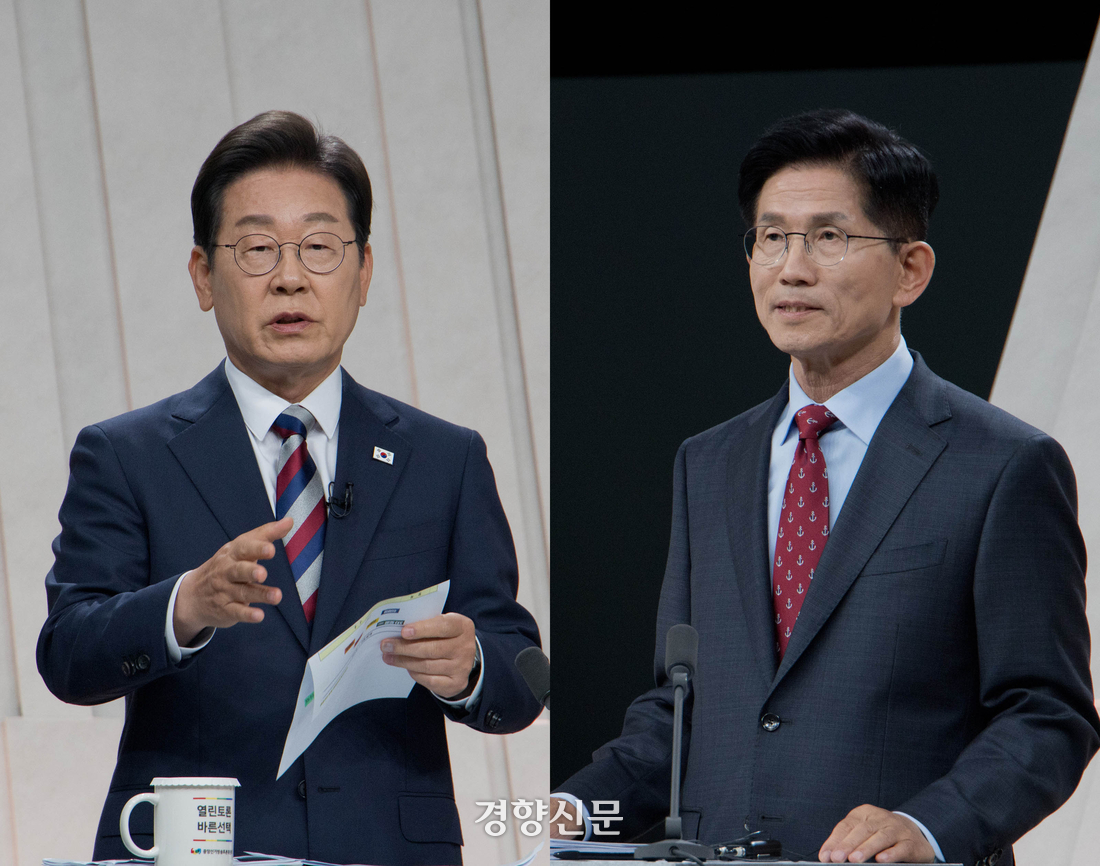 이재명 더불어민주당 대선 후보와 김문수 국민의힘 대선 후보가 27일 서울 상암동 MBC 스튜디오에서 정치·외교 분야를 주제로 TV토론을 하고 있다. 국회사진기자단 |