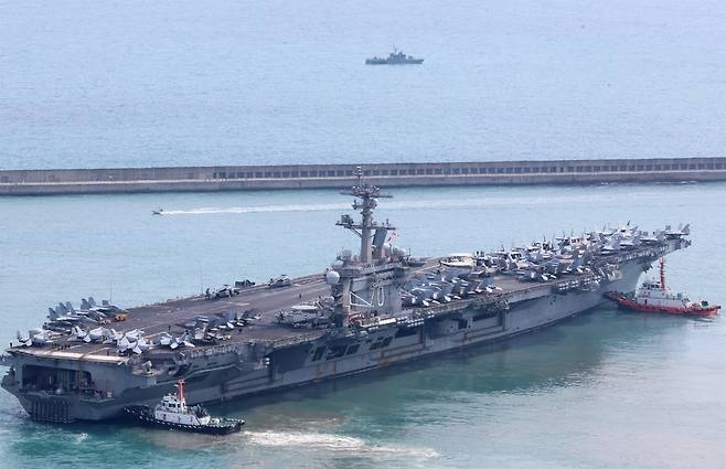 지난 3월 7일 오후 부산 해군작전기지에 미 해군 제1항모강습단 소속 핵 추진 항공모함 칼빈슨함(CVN-70)이 한미일 연합훈련 및 한미 연합 ‘자유의 방패’(프리덤실드·FS) 를 위해 출항하고 있다. [사진 = 연합뉴스] |