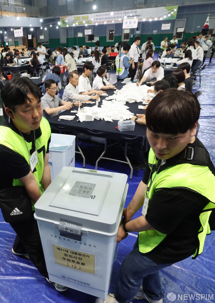 [서울=뉴스핌] 김학선 기자 = 제21대 대통령선거 투표가 끝난 3일 저녁 서울 영등포 다목적 배드민턴 체육관에 마련된 개표소에 투표함이 옮겨지고 있다. 2025.06.03 yooksa@newspim.com