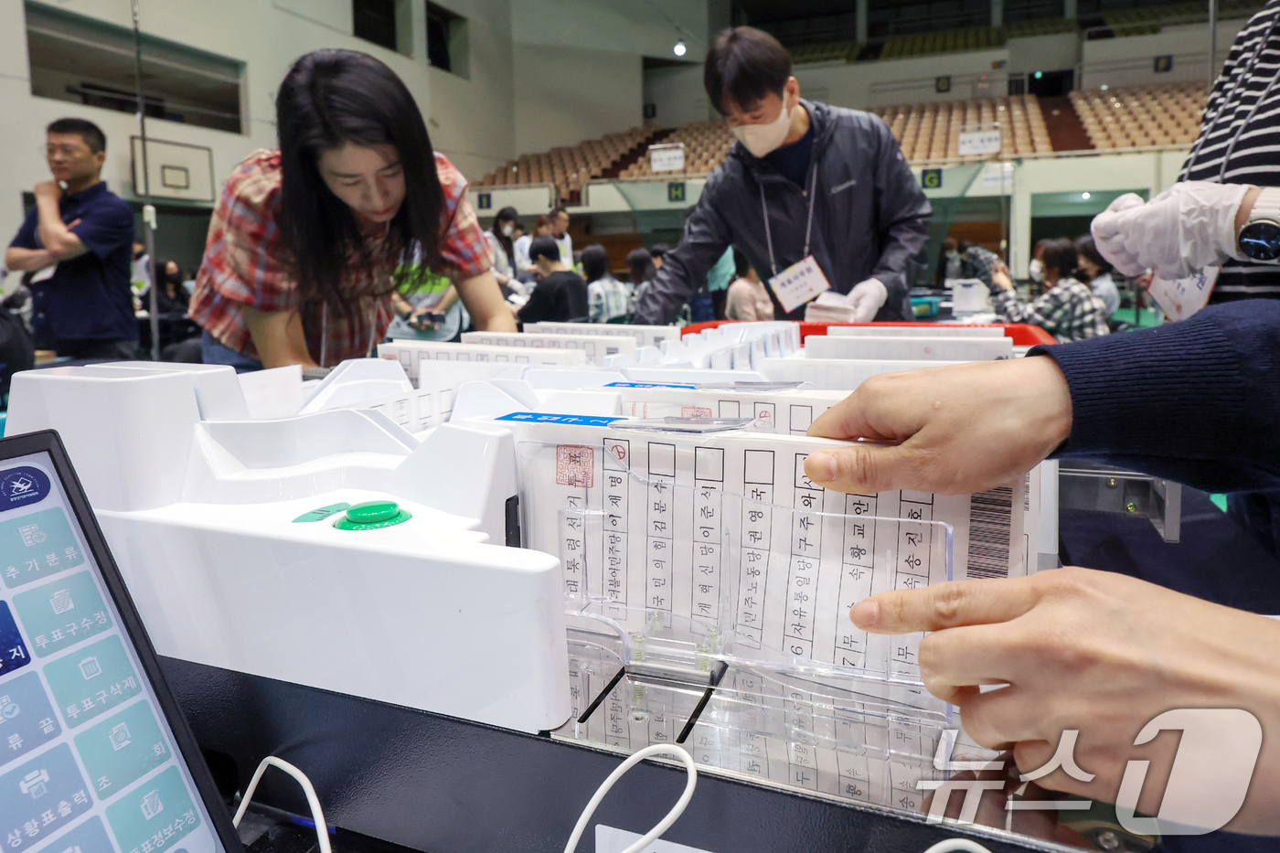 (서울=뉴스1) 민경석 기자 = 제21대 대통령 선거 투표일인 3일 오후 서울 관악구 서울대학교 체육관에 마련된 개표소에서 선거사무원들이 투표지분류기를 이용해 1차 분류 작업을 실시하고 있다. 2025.6.3/뉴스1