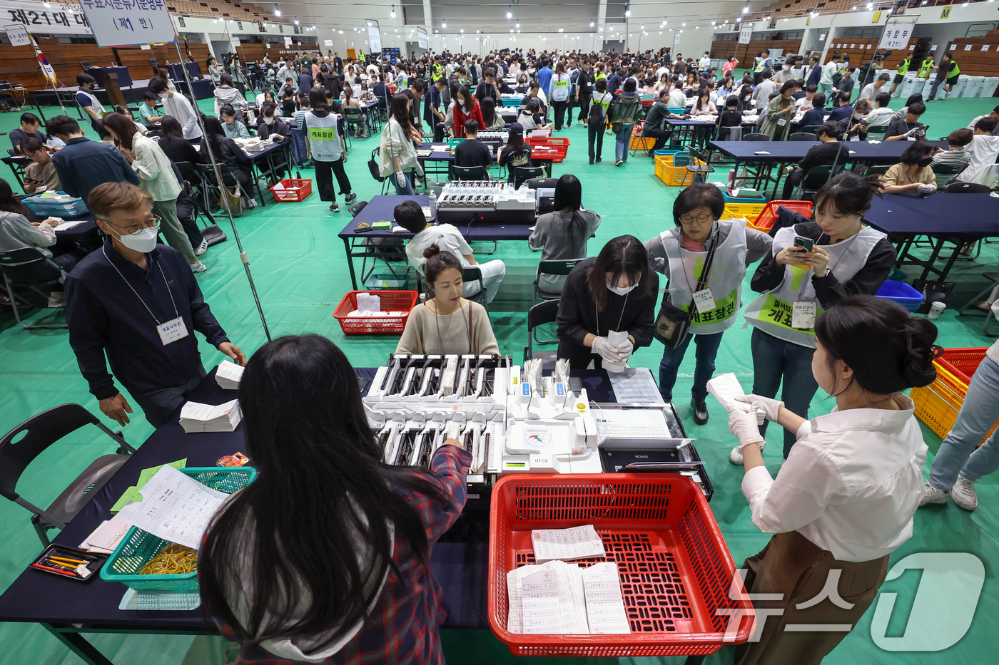 (서울=뉴스1) 민경석 기자 = 제21대 대통령 선거 투표일인 3일 오후 서울 관악구 서울대학교 체육관에 마련된 개표소에서 선거사무원들이 투표지분류기를 이용해 1차 분류 작업을 실시하고 있다. 2025.6.3/뉴스1