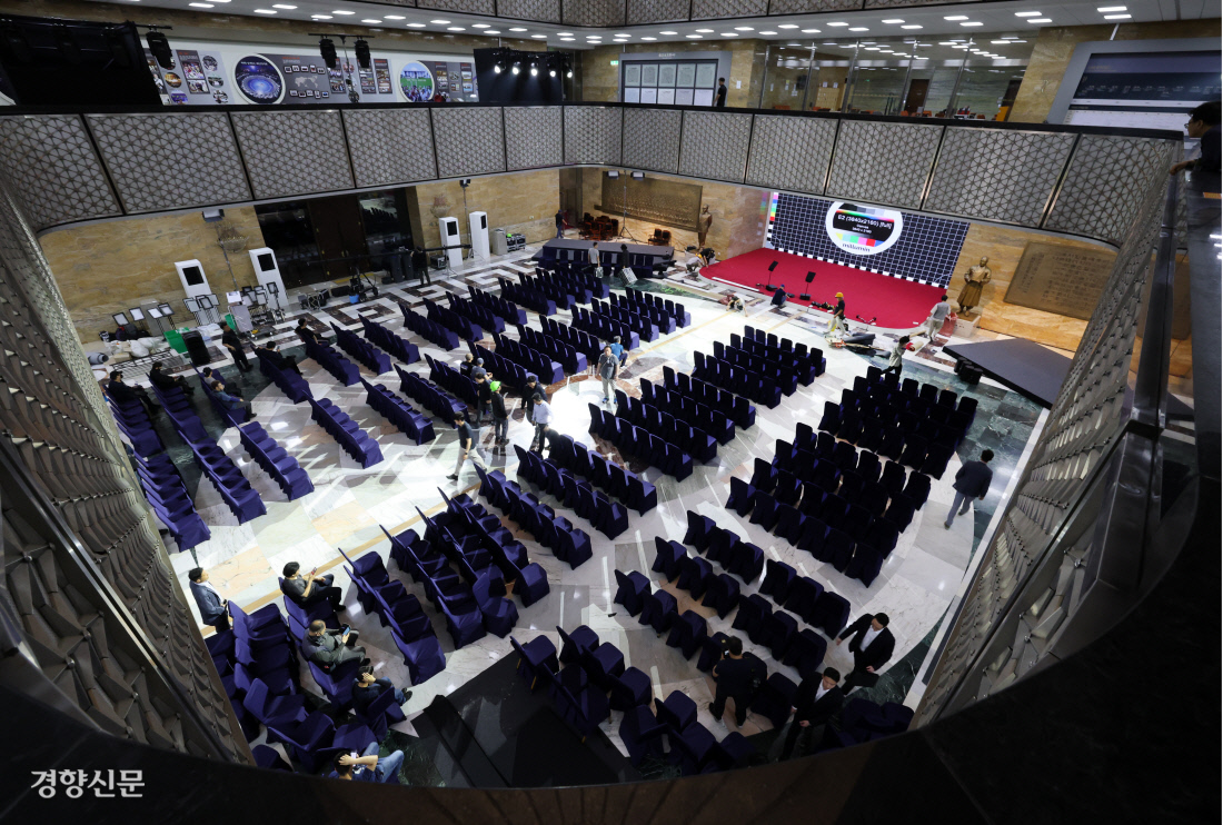 취임식 준비하는 국회 로텐더홀 제21대 대통령 선거일인 3일 국회 로텐더홀에서 관계자들이 다음날 열릴 대통령 취임식 준비를 하고 있다. 박민규 선임기자 |