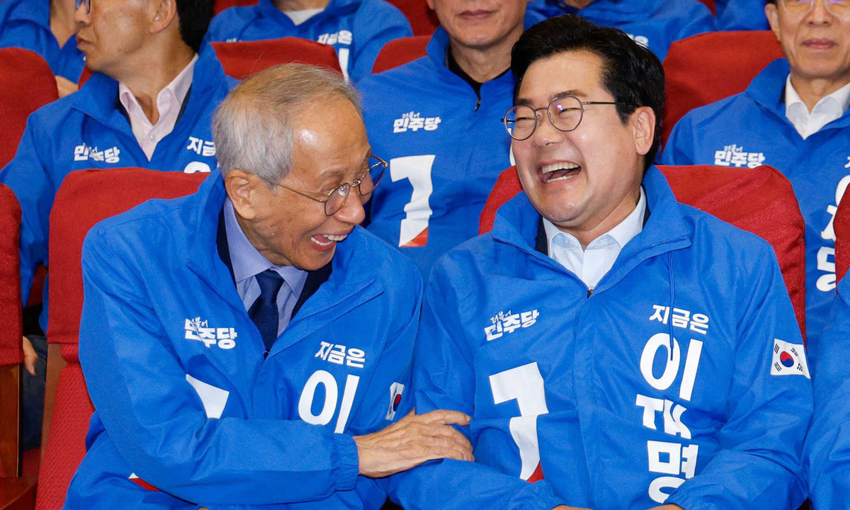 윤여준, 박찬대 진짜 대한민국 선거대책위원회 상임총괄선대위원장 등이 3일 서울 여의도 국회 의원회관에 마련된 제21대 대통령선거 개표상황실에서 방송사 출구조사 결과를 보며 기뻐하고 있다. 공동취재사진 |