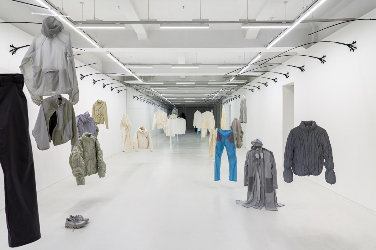 일민미술관의 ‘시대복장’전은 패션 브랜드가 미술 전시의 기법을 빌려 매장을 꾸미는 방식에서 착안해 미술관에 옷을 전시했다. 패션 디자인 스튜디오인 ‘포스트아카이브팩션’이 제작한 옷을 낚싯대에 걸린 형태로 전시한 설치 작품 ‘투망’. 스튜디오오실로스코프 촬영·일민미술관 제공 |