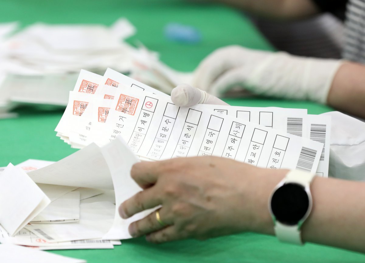 제21대 대통령 선거 투표가 종료된 3일 오후 부산 남구 국립부경대학교 대연캠퍼스 체육관에 마련된 개표소에서 개표사무원들이 투표지 분류 작업을 하고 있다. 2025.6.3 뉴스1 |