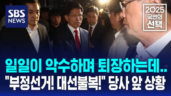 김문수 국민의힘 후보가 선대위 관계자들과 인사하며 나오자, 당사 앞에 몰려든 사람들이 "부정 선거! 대선 불복"을 외쳤습니다.