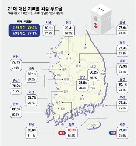 20대 대비 투표율 상승폭이 가장 큰 지역은 부산이었다. 부산은 지난 대선에 비해 3.1%P 오른 78.4%의 투표율을 보였다. 두 번째로 투표율이 크게 오른 지역은 인천과 세종이었다. 두 지역은 각각 2.9%P 오른 77.7%와 83.1%의 투표율을 기록했다.