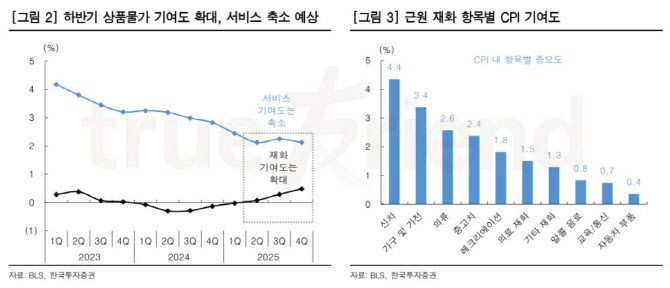 4일 문다운 한국투자증권 연구원은 트럼프 관세에 따른 상품물가 상승으로 하반기 근원물가 상승률은 3%대로 올라설 것으로 예상했다. 4월부터 부과된 보편관세 10%와 자동차 25% 등 품목별 관세의 효과가 시차를 두고 소비자물가에 반영될 것으로 보이기 때문이다.