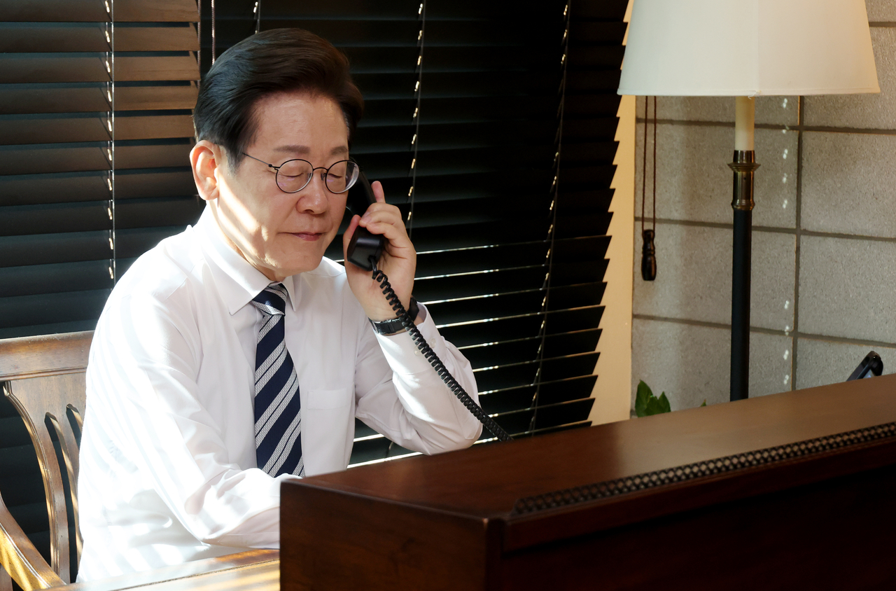 이재명 대통령이 4일 인천 계양구 사저에서 김명수 합참의장과 통화하며 군 통수권 이양 보고를 받고 있다. <연합> |