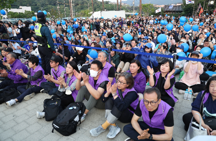 이태원 참사 유가족들이 지난 5월 29일 서울 관악구 관악산 으뜸공원에서 열린 더불어민주당 이재명 당시 대선후보 유세에 참석해 이 후보의 발언을 경청하고 있다. 연합뉴스 |