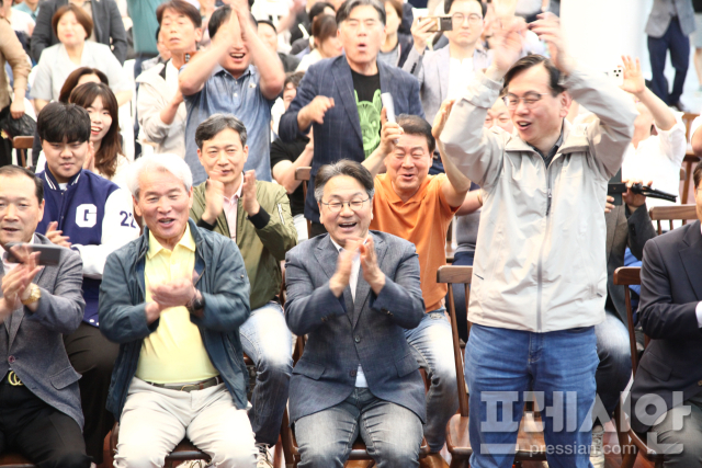 ▲강기정 광주시장과 광주시민들이 광주시청에서 개표방송을 보며 환호하고 있다.2025.6.03ⓒ프레시안(백순선) |