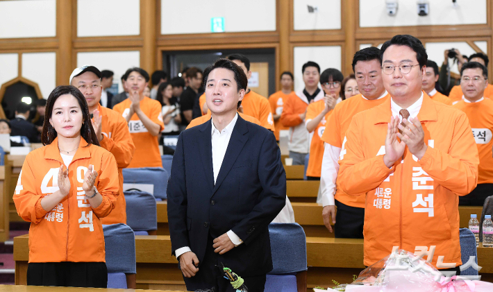 개혁신당 이준석 제21대 대통령선거 후보가 3일 서울 여의도 국회 의원회관에 마련된 개표상황실에 도착해 당원들의 격려를 받고 있다. 방송3사 출구조사는 이재명 51.7%, 김문수 39.3%, 이준석 7.7%로 예측됐다. 박종민 기자 |