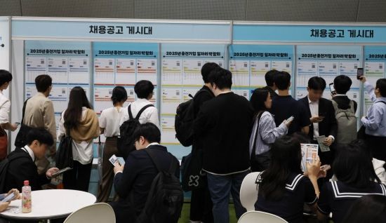 지난 4월 서울 강남구 코엑스에서 열린 2025년 중견기업 일자리 박람회를 찾은 구직자들이 채용공고 게시판을 살펴보고 있다. |