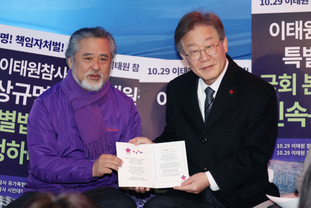 ▲더불어민주당 이재명 대표가 15일 오후 국회 앞 이태원참사특별법제정 촉구 농성장에서 이정민 시민대책위원회 운영위원장으로부터 연하장을 받고 있다. ⓒ연합뉴스 |