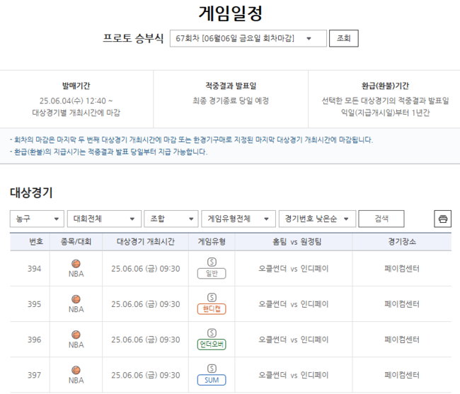 국민체육진흥공단이 발행하는 체육진흥투표권 스포츠토토의 수탁사업자 스포츠토토코리아가 오는 6월 6일(금) 오전 9시 30분(한국시간)에 페이컴 센터에서 열리는 2024-2025시즌 미국프로농구(NBA) 파이널 1차전, 오클라호마시티 썬더와 인디애나 페이서스의 경기를 대상으로 한 프로토 승부식 67회차 게임이 발매된다고 4일(수) 밝혔다.