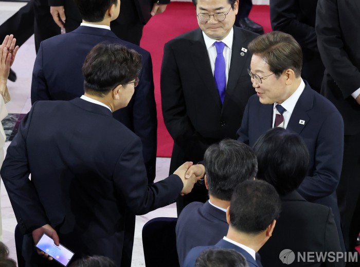 [서울=뉴스핌] 국회사진기자단 = 제21대 대통령에 당선된 이재명 대통령이 4일 국회 로텐더홀에서 열린 취임선서에서 권성동 원내대표와 악수하고 있다. 2025.06.04 photo@newspim.com