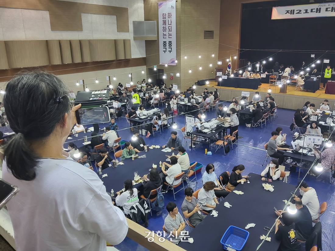 지난 3일 밤 서울 중구 중구구민회관에 마련된 대선 개표소에서 200여 명의 선관위 관계자·개표 사무원 등이 분주히 개표작업을 진행했다. 사고에 대비해 서울중부경찰서·서울중부소방서 관계자들이 현장을 지켰다. 각 정당·후보자가 보낸 선거 참관인들과 자발적으로 참관을 신청한 개표참관인·관람인 30여명도 개표를 지켜봤다.