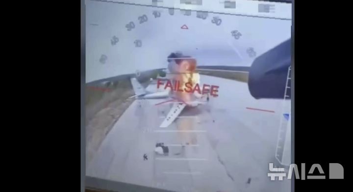 [AP/뉴시스] 1일(현지 시간) 우크라이나 보안국이 공개한 영상에서 우크라이나 드론이 러시아 영토 깊숙이 침투해 전투기를 공격하는 모습. 2025.06.04. |