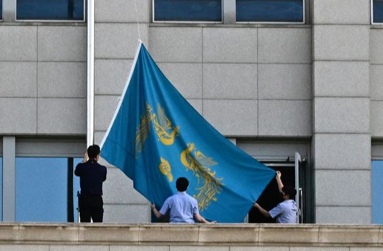 이재명 대통령 취임 첫날인 4일 오전 서울 용산 대통령실 청사에서 관계자들이 대한민국 국가원수의 상징인 봉황기를 게양하고 있다. [사진 사진기자협회] |