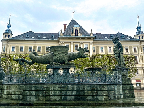 클라겐푸르트 구시가의 중심인 노이어(Neuer) 광장에 있는 '린드부름(Lindwurm) 분수'와 헤라클레스 조각상 [사진/권혁창 기자] |