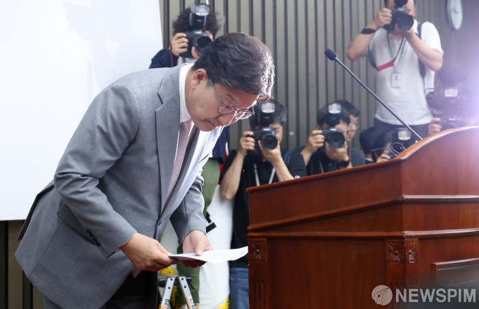 [서울=뉴스핌] 정일구 기자 = 권성동 국민의힘 원내대표가 5일 오전 서울 여의도 국회에서 열린 의원총회에서 사퇴 의사를 밝힌 뒤 고개 숙여 인사하고 있다. 2025.06.05 mironj19@newspim.com