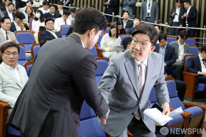 [서울=뉴스핌] 정일구 기자 = 김용태 국민의힘 비상대책위원장과 권성동 원내대표가 5일 오전 서울 여의도 국회에서 열린 의원총회에서 인사를 나누고 있다. 2025.06.05 mironj19@newspim.com |