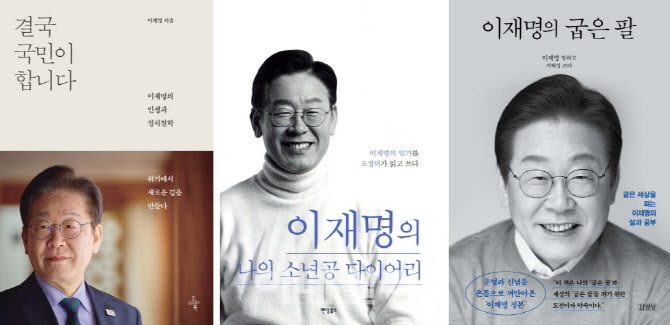 이재명 대통령 저서 ‘결국 국민이 합니다’, ‘이재명의 나의 소년공 다이어리’, ‘이재명의 굽은 팔’ 표지. (사진=예스24) |