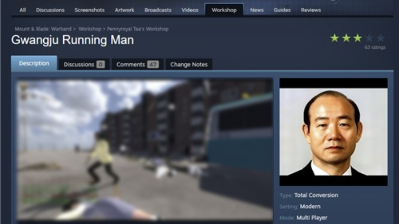 문제의 '광주 런닝맨'은 독립적인 게임이 아닌, '마운트 앤 블레이드: 워밴드'라는 2008년 작 게임의 모드(mod·게임 내용을 수정하는 개조 파일)입니다.
