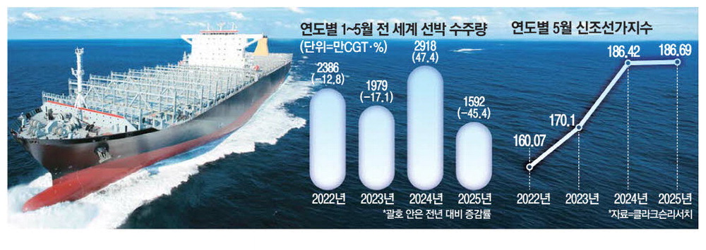 하지만 작년을 빼고 보더라도 올해 1~5월 전 세계 선박 수주량은 2023년에 비해 19.5%. 2022년에 비해선 33.3% 줄어 감소세가 뚜렷하다.