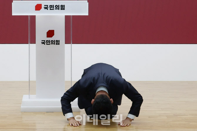 김문수 국민의힘 전 대선 후보가 4일 서울 여의도 중앙당사에서 열린 제21대 대통령선거 국민의힘 중앙선거대책위원회 해단식에서 발언 도중 절을 하고 있다 (사진=연합뉴스) |
