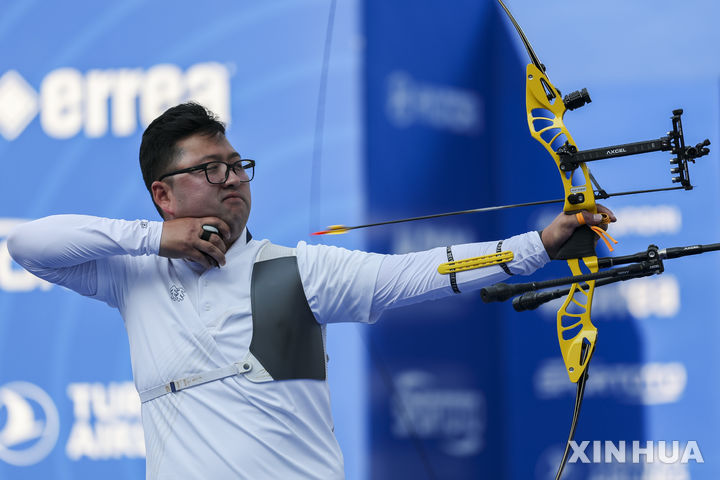 [상하이=신화/뉴시스] 김우진이 11일(현지 시간) 중국 상하이에서 열린 2025 양궁 현대 월드컵 2차 대회 리커브 남자 개인전 결승 경기를 펼치고 있다. 김우진은 마티아스 그란데(멕시코)를 7-1(26-26 28-24 30-28 30-27)로 꺾고 금메달을 목에 걸었다. 2025.05.12. |