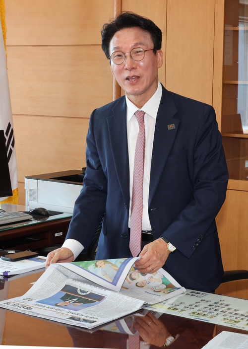 김민석 국무총리 후보자가 5일 서울 종로구 금융감독원 연수원에 마련된 인사청문회 준비단 사무실로 출근해 매일경제신문을 읽고 있다. [이충우 기자] |