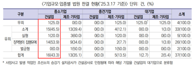 기업규모별로는 ▲중소기업 29건(78.4%) ▲중견기업 5건(13.5%) ▲대기업 3건(8.1%) 순이다. 중소기업 판결은 유죄 28건(96.6%), 무죄 1건(3.4%)이었다. 28건의 중소기업 유죄 판결 중 건설업이 15건으로, 중소 건설사 유죄 선고 비율이 높았다.