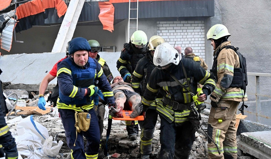 우크라이나 하르키우에서 구조대원들이 부상자를 구조해 이송하고 있다. AFP=연합뉴스 |