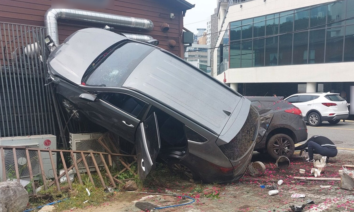 이어 전방 150m 가량 돌진한 SUV는 주차돼 있던 또 다른 SUV를 들이받은 뒤, 한 식당 건물 철재 펜스와 화장실 외벽을 잇따라 들이받은 뒤에야 멈춰 섰다.