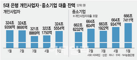 8일 금융권에 따르면 KB국민·신한·하나·우리·NH농협 등 5대 시중은행의 지난달 말 기준 개인사업자 대출 잔액은 324조 5554억원으로 올 1월 324조 9356억원보다 3802억원 감소했다. 3월 321조 8869억원까지 줄었다가 다시 반등했으나 연초 수준에도 못 미치고 있다. 같은 기간 중소기업 대출 잔액은 지난달 기준 666조 7411억원으로 전달 대비 약 1조 8000억원 증가했다. 이는 올해 1월(662조 6232억원) 대비 4조원 이상 늘었다.