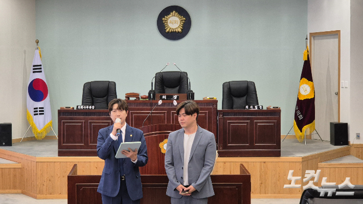 대구 남구의회 본회의장에서 기자회견 중인 이정현, 강민욱 남구의원. 곽재화 기자 |