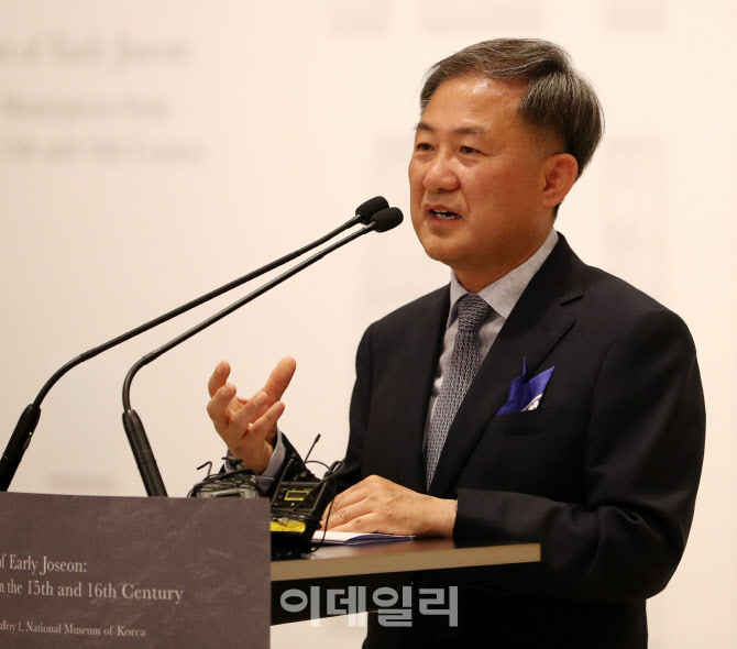 [이데일리 김태형 기자] 김재홍 국립중앙박물관장이 9일 서울 국립중앙박물관에서 열린 ‘새 나라 새 미술 : 조선 전기 미술 대전’ 특별전에서 인사말을 하고 있다.
