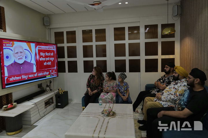 [하이데라바드=AP/뉴시스] 지난달 12일(현지 시간) 인도 하이데라바드에서 한 가족이 나렌드라 모디 총리의 대국민 담화를 TV로 시청하고 있다. 무력 충돌을 벌였던 인도와 파키스탄이 극적으로 휴전에 합의한 가운데, 모디 총리는 이날 TV 연설을 통해 “신두르 작전은 테러와의 싸움에서 새로운 노선과 기준, 상식을 제시했다”라고 밝혔다. 2025.06.09. |