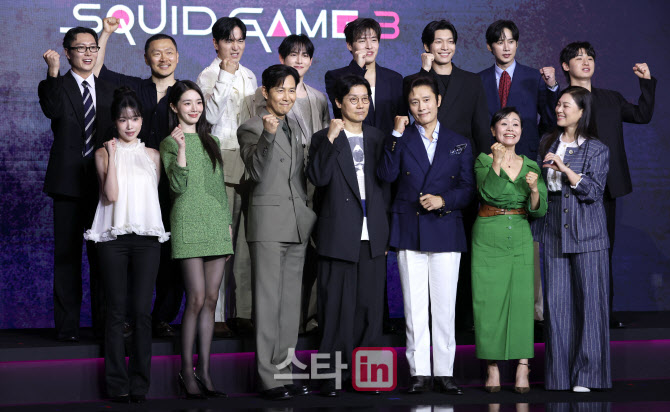 [이데일리 스타in 방인권 기자] 황동혁 감독과 배우 이정재, 이병헌을 비롯한 참석자들이 9일 서울 용산구 드래곤시티에서 열린 넷플릭스 '오징어 게임 시즌3' 제작발표회에 참석해 포토타임을 갖고 있다.