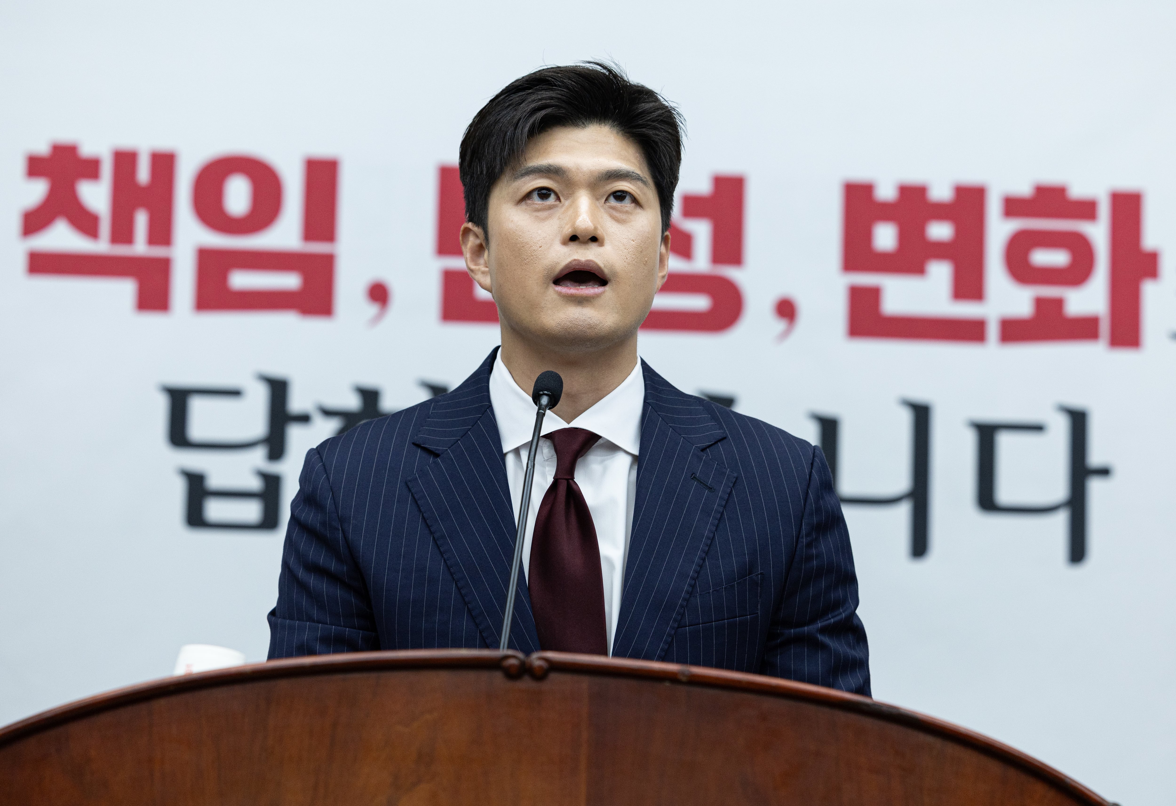 김용태 국민의힘 비상대책위원장이 9일 국회에서 열린 의원총회에서 발언을 하고 있다. /뉴스1 |