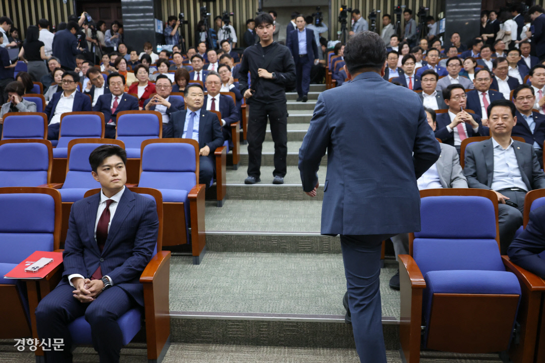 남은 자와 떠나는 자 김용태 국민의힘 비상대책위원장(왼쪽)이 9일 국회에서 열린 의원총회에서 권성동 원내대표(오른쪽 뒷모습)가 발언한 뒤 회의장을 떠나는 모습을 바라보고 있다. 성동훈 기자 zenism@kyunghyang.com |