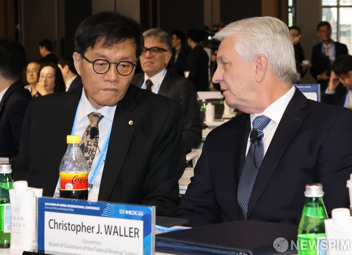 [서울=뉴스핌] 양윤모 기자 = 이창용 한국은행 총재가 2일 오전 한국은행 별관 컨퍼런스홀에서 개최된 통화정책 학술회의 '2025년BOK 국제컨퍼런스' 발표 행사에 참석 크리스토퍼 월러(Christopher J. Waller) 미국 연방준비제도 이사와 대화를 하고 있다. 20주년을 맞은 이번 행사는 '경제 구조 변화와 통화정책(Structural Shifts and Monetary Policy)'을 주제로 이창용 한국은행 총재,크리스토퍼 월러(Christopher J. Waller) 미국 연방준비제도 이사,엘리 레몰로나(Eli M. Remolona Jr) 필리핀 중앙은행 총재, 토머스 사전트(Thomas J. Sargent) 뉴욕대 교수 등이 참석했다. 2025.06.02 yym58@newspim.com |