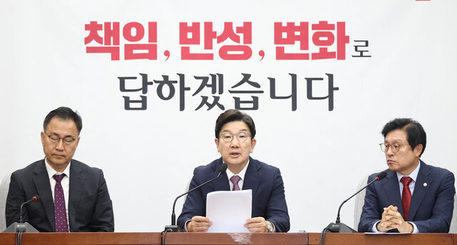 권성동 국민의힘 원내대표가 10일 오전 국회에서 열린 원내대책회의에서 발언하고 있다. 윤운식 선임기자 yws@hani.co.kr |