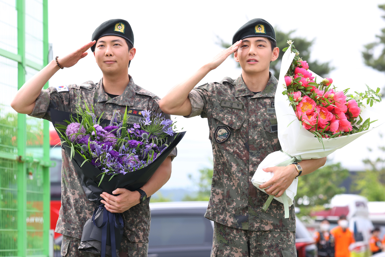 [헤럴드경제=이명수 기자]그룹 방탄소년단(BTS)의 RM(본명 김남준·31)과 뷔(본명 김태형·30)가 현역 군 복무를 마치고 10일 사회로 복귀했다.