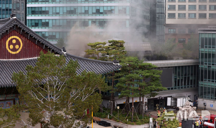 [서울=뉴시스] 홍효식 기자 = 10일 서울 종로구 조계사 한국불교역사문화기념관에서 화재가 발생해 소방대원들이 투입하고 있다. 2025.06.10. yesphoto@newsis.com |