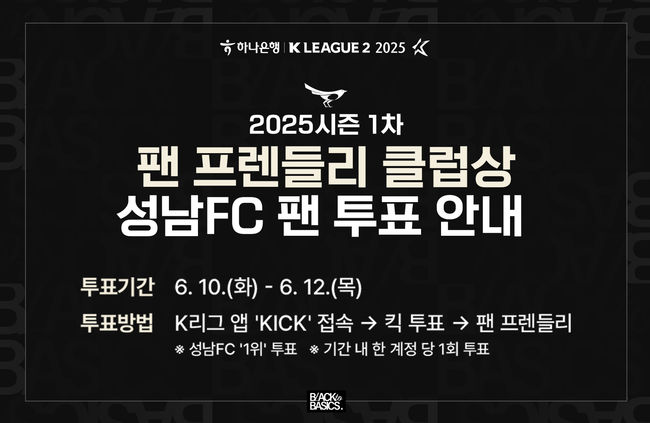 1차 팬 프렌들리 클럽상 팬 투표는 6월 10일(화) 오전 8시부터 6월 12일(목) 자정까지 ‘K리그 KICK 어플’을 통해 참여할 수 있으며, 팬들은 성남FC를 1순위로 선택해 구단에 응원의 한 표를 보낼 수 있다.