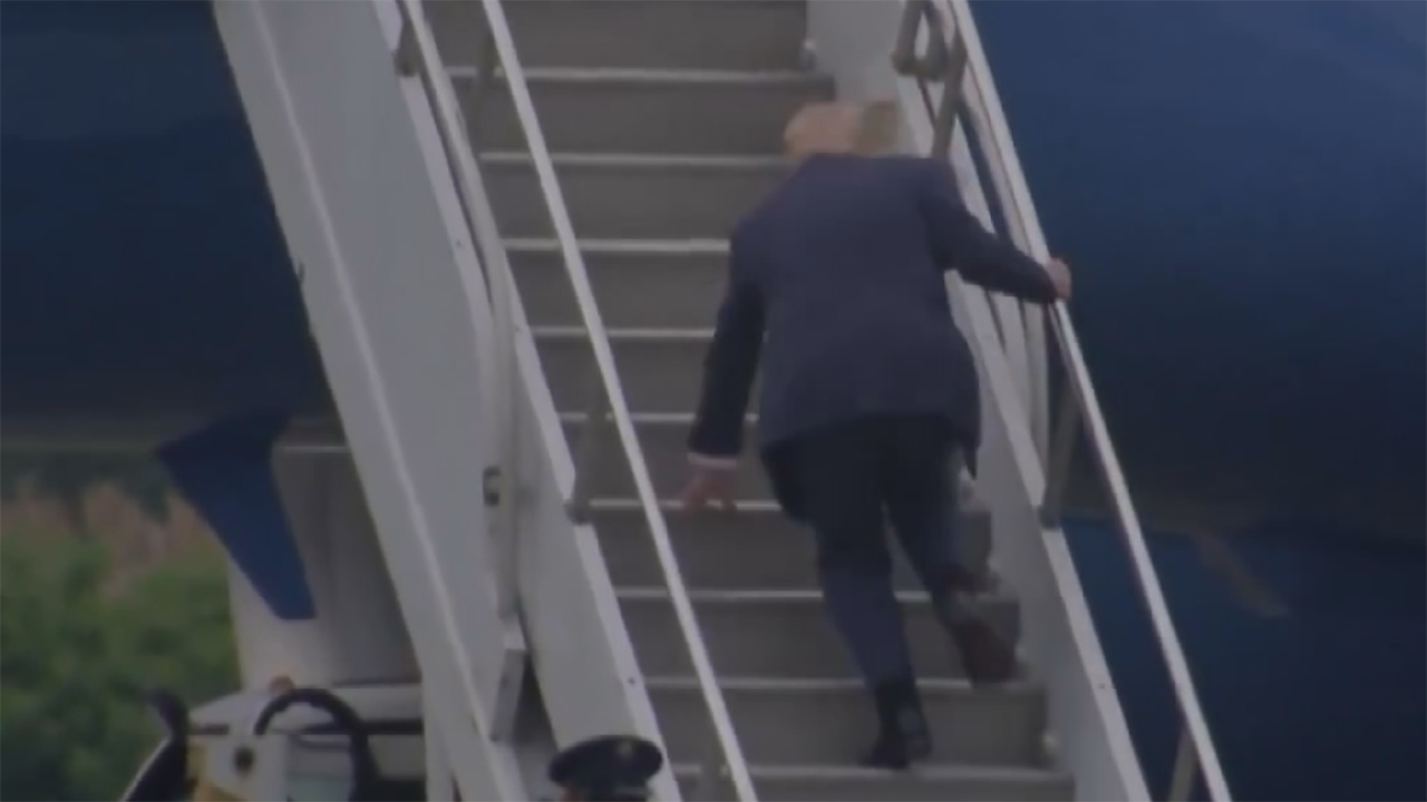 트럼프 미국 대통령이 전용기 계단을 오르다 휘청이는 모습을 보였습니다. 대통령 시절 계단에서 세 번이나 휘청였던 바이든을 트럼프는 작년 대선 운동서 조롱한 바 있습니다.