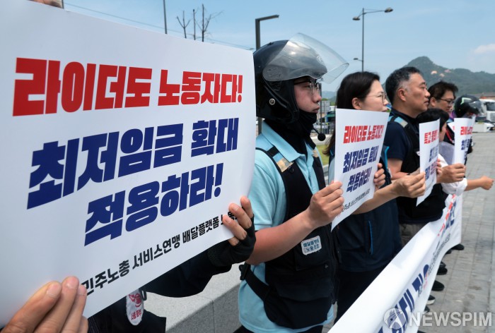 [서울=뉴스핌] 이길동기자= 민주노총 전국서비스산업노동조합연맹 배달플랫폼 노동조합원들이 9일 서울 종로구 정부서울청사 앞에서 배달노동자 최저임금 확대 적용 촉구를 위한 기자회견을 하고 있다. 2025.06.09. gdlee@newspim.com |